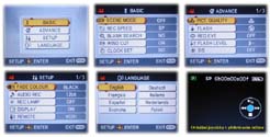 Pod tlačítkem MENU je možné nalézt mnoho dalších nastavení kamery a to dělených do podpoložek zvaných BASIC, ADVANCE, SETUP a LANGUAGE. Složka BASIC nabídne například výběr přednastavených nahrávacích režimů (tj. Sport, Portrét, Nízké osvětlení, Bodové osvětlení a "Sníh a pláž"), rychlost záznamu SP/LP anebo tu lze nastavit datum a čas. V části ADVANCE je vesměs vše o nastavení funkce blesku, nastavení stabilizátoru obrazu ON/OFF, digitálního zvětšení nebo volby režimů záznamu 4:3 či 16:9. U této kamery se dá hovořit o tzv. plném režimu 16:9 - obraz se částečně rozšíří, ale zároveň se mírně v horní a spodní části ořízne (snímací čipy mají tvar 4:3). V části SETUP lze např. vypnout LED diodu indikace nahrávání či vyřadit vypínání kamery po 5 minutách. Tady je jediný digitální efekt kamery, a to zatmívačka (buď černá nebo bílá): Panasonic stejně jako u dalších modelů nové řady vypustil všechny další obrazové a digitální efekty, a tak je potřeba vše řešit až v písíčku (osobně jsem na kameře jakékoli efekty nikdy nevyužil). Poslední část Menu LANGUAGE nabízí výběr jednoho z osmi jazyků, absenci češtiny jsme uváděli už minule. Je tu ale např. druhdy zmiňovaná polština, takže třeba se příští rok už dostane (?) i na nás…