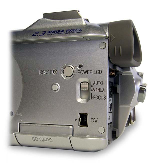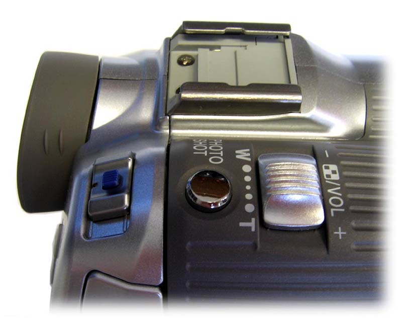 Konektory GS150 (a také GS140). Zejména u modelu NV-GS150 se předpokládala mnohem větší nabídka oproti základním typům a skutečnost bude asi někde na půli cesty. Klasikou je ne u všech výrobců samozřejmý (protože universální a nahraditelný) 3,5 mm JACK s analogovým AV-výstupem (vlevo) a možností napojení i sluchátek, konektor digitálního rozhraní FireWire pod LCD a zdířka S-video. V dnešní době by se standardem už měl stát i USB výstup 2.0 (stahují se přes něj pouze fotky a videokameru lze také využít jako tzv. webovou). Mikrofonní zdířka pak slouží i pro napojení kabelového dálkového ovladače. Jediné co bych zřejmě Panasonicu vytkl, je odblokování pouze digitálního DV-vstupu, takže kdo se těšil na digitalizaci starších analogových nahrávek, nebude rozhodně potěšen (model GS140 nemá ani tento DV-vstup). Jako další přípojné místo by se dala označit již zmíněná inteligentní botka k uchycení mikrofonu, světla nebo blesku, což je ale u této firmy tak speciální příslušenství, že většina prodejců ani netuší, že existují…