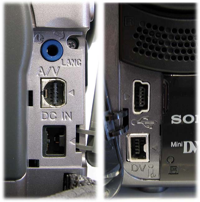 Přípojné konektory a jejich možnosti. Jakoby tu vývojáři Sony u HC90 přísně oddělili analogové a digitální zdířky, i když jen na přední části samotného přístroje. Snímky napovídají, že přední krytka pod objektivem ukrývá digitální konektor Fire-Wire (u Sony obvykle i-LINK) a USB-port, přičemž jen o kousek vpravo zboku je tu (bohužel) speciální AV-zdířka (je včetně S-Video); nad níž je neméně speciální LANC-konektor a pod ní pak napájecí a nabíjecí obdélníček DC-IN. Je-li formulace o AV-zdířce pochopena jako malé rozčarování, pak je tu právem opět připomínkován systém speciálních (nekompatibilních) konektorů, které se v poslední době staly pomyslnou módou u firem Sony a JVC. Tyto typy uspořádání kontaktů totiž nejsou v případě ztráty nebo potřeby dokoupení druhého AV-kabelu nahraditelné běžnou universální kabeláží (např.) firmy Hama, nehledě k (ne)pomoci propojení třebas kolegovým káblíkem od běžné kamery v horském nebo přímořském hotelu. Nutná informace k doplnění odstavce je o oboustranné průchodnosti (nejen) digitálních zdířek: přístroj tedy má všechny vstupy včetně AD-převodníku…