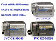 JVC Everio G. Přestože například německá (čili evropská) nabídka obsahuje plných sedm modelů, zaplapánbůh - při známé opatrnosti čs. zastoupení JVC v dodávkách - alespoň za popisované trio, i když si myslíme, že jeden druh s 2,21MPx by se uživil také. Obdrželi jsme tedy z JVC CZ typy GZ-MG20, MG40 a MG50, z nichž jediný poslední má větší HDD s kapacitou 30GB. Hned na začátku si vyjmenujme logiku pojmenování výrobcem. Diskové kamery Everio G vlastně nabízejí několik stupňů výbavy: základní CCD s 0,8MPx a 20GB diskem (MG20), s tímtéž čipem a větším diskem 30GB (MG30/33), s větším CCD 1,33MPx a diskem 20GB (MG40), totéž s 30GB místa na HDD (MG50) a duem 2megapixelovek s 20 a 30ti GB disky, jež jsou u nás (zatím?) nedostupné (MG60 a MG70). Vyjmenované modely jsou si velice podobné a drobné odlišnosti vzhledu jsou v parametrech objektivů a odstínech barev těl, jak je (snad) dobře patrno ze srovnávacích obrázků (i u textu). Naše povídání bude logicky o zmíněném triu, ale kdyby se někdy podařilo z českého JVC ako náhle obdržet další modely, určitě se zmíníme…