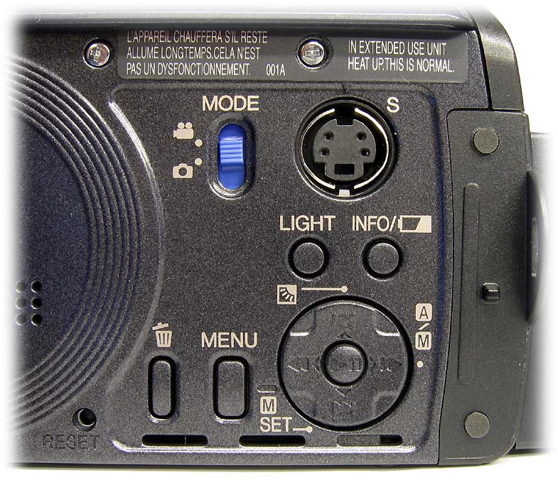 Ovládání diskových kamer na levé straně je minimem prvků. Kromě hlavního vypínače, kterým se samozřejmě volí i režimy nahrávání/přehrávání, je pod displejem ukryt modrý video/foto-přepínač MODE, S-video výstup a skupina devíti tlačítek vlastního ovládání. LIGHT zde samozřejmě zapíná přisvětlení, INFO umí ukazovat postupným mačkáním ještě zbývající kapacitu disku při různých stupních komprese (tj. kvality) a schopnost akumulátoru v procentech i minutách natáčení podle zbytkové energie a kousek níže jsou zbylá 2 tlačítka a vícefunkční křížkový ovladač. Jakýsi odpadkový koš slouží coby notoricky známý povel k mazání scény či fotky, MENU je vstup do hlavní nabídky (mj. jako z oka vypadlé kartovým modelům Everio) a pětičudl má lakované symboly pro nahrávací režim a lisované (tj. embosované, komu se líbí) značky pro přehrávací mód přístroje. Celkový dojem z popisovaných diskových kamer je jednoznačný: Victor nabízí světu tak jednoduché ovládání, že snad ani sporák, kuchyňský mixér anebo mikrovlnka už nemají být jednodušší…