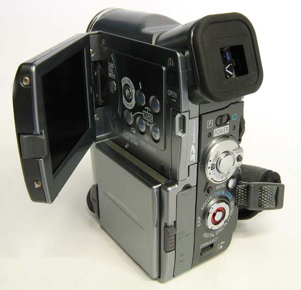Téměř zcela kovová kazetová mechanika je - jak je tomu dnes u dlaňových kamer Canon poměrně dlouho „zvykem“ - otevírána vyklápěním celého pravého dílu i s hlavním vypínačem směrem ven (tj. doprava), pomocí posuvné západky dole pod kruhovým voličem funkcí (viz obrázek). Klasický výklopný výtah zakončený systémem „vetřelec“ není nijak odlišným od běžných zvyklostí nakládání kazet. Uspořádání celé dlaňové řady musí ale už od předchozích modelů budit v každém technickém fandovi úžas (odezírejme z obrázků): jak tam dovnitř ti šikovní Japonci dostali někam ještě i tu elektroniku, když to vypadá až tak neprůchodně zaplněno: prakticky celou horní část zabírá objektiv s hledáčkem a mikrofony, boční pravá část je zcela vyplněna díly mechaniky a levou stranu stroje obsazuje výklopný LCD-panel a patice akumulátoru. A kde zdánlivě zbylo místo, tam jsou ještě například ukryty přípojné konektory, jejichž kompletní popis je součástí jednoho z dalších odstavců této dnešní „malé“ recenze…