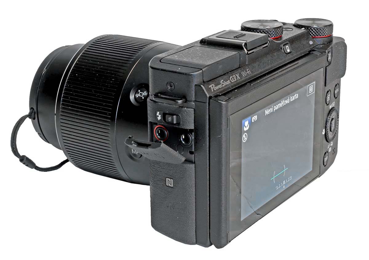 Jdeme na rozhraní. PowerShot G3 X má A/V výstup, mini HDMI výstup, miniUSB, vstup pro externí mikrofon a výstup na sluchátka. Fotoaparát pohání známý akumulátor NB-10L, který vydrží sice cca 300 fotografií, ale náhradní AKU není od věci. Otvor pro baterie je zespodu stejně jako slot pro paměťovou kartu SD/SDHC/SDXC. Abych nezapomněl: je tu bezdrátové spojení WI-FI s NFC, můžeme tedy ovládat strojek i stahovat záznamy chytrým zařízením...