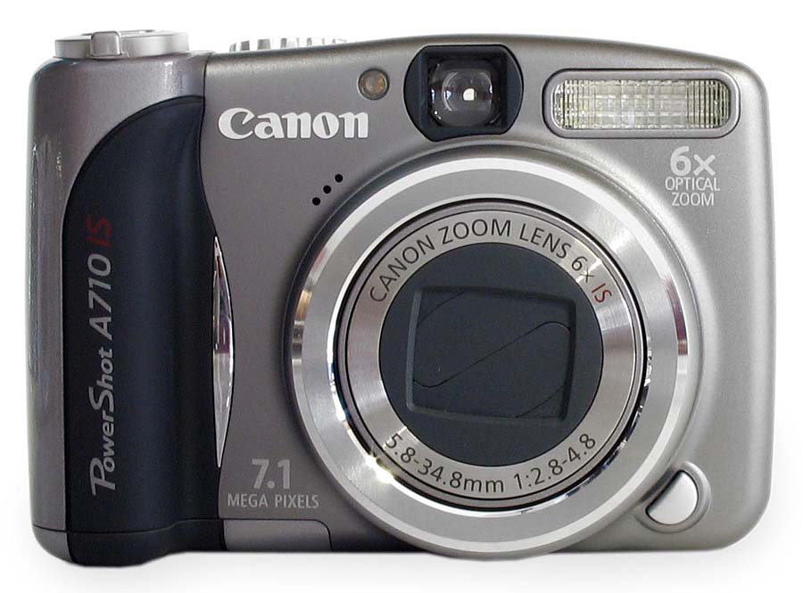 Stabilizovaný Canon PS-A710 IS (Klikni pro zvětšení)Jako další novinku si pro nás firma Canon připravila model PowerShot A710 IS. Je to model nahrazující typ A700 a změn naznal vcelku dost. Asi tou nejzajímavější je optická stabilizace, která při focení s maximálním až šestinásobným přiblížením jistě může velmi pomoci. Ohnisková vzdálenost je 5,8-34,8 mm a ekvivalent ke kinofilmu 35-210 mm. Objektiv je opět možné doplnit jak širokoúhlou předsádkou, tak telekonvertorem. CCD čip tu disponuje 7,1 milionu bodů (úhlopříčka 1/2,5") s maximálním rozlišením snímku 3.072 x 2.304 bodů. Stejně jako u předchůdce stačí pro napájení dvojice tužkových článků AA a s výrobcem dodanými alkalickými články by mělo být možné nafotit přibližně 100 snímků. S nabíjecími NiMH články pak výdrž vzroste podle kapacity až na 360 fotek. Oproti modelům A630/640 je tělo menší - 97,5 x 66,5 x 41,2 mm (ŠxVxH) - a lehčí (210 g). Displej má stejnou úhlopříčku 2,5" a stejný počet bodů (115.000), ale není možné jej vyklopit; a nad elcédéčkem je klasický průhledový hledáček. Ovládání je v podstatě shodné s předchozími dvěma modely. Dodám, že všechny tři popisované typy mají možnost uchycení na stativ...