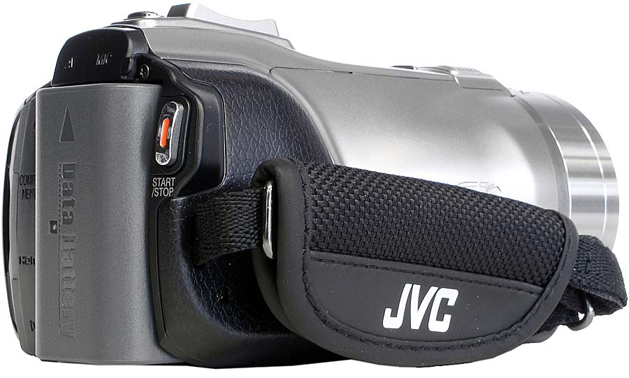 JVC GZ-HM1S v detailu shora (Kliknutí zvětší)Videokamera JVC HM1 se oproti předchozímu modelu HM400 příliš nezměnila. Hlavní výsadou čili doplněním se stává dvojitá vnitřní pamě, dosahující úctyhodných (ale i u konkurence volitelně možných) 64 GB. český web JVC uvádí při maximálním datovém toku možnost nahrát až 8 hodin a 34 minut, což ovšem při zběžném výpočtu tak nějak nesedí. Při datovém toku 24Mbps nahraje kamera každou vteřinu asi 3 MB a do 64 GB se takovýchto asi-vteřin vleze 21333, tedy 5 hodin, 55 minut a 33 vteřin. Kromě vnitřní paměti lze samozřejmě zvolit záznam na paměové SD-karty. Podporovány jsou SDHC karty (tedy do 32 GB), a to s třídou záznamu Class 4 a více. Drobným vylepšením prošel dle českých stránek JVC prý také snímací čip, HM1 ukrývá CMOS s úhlopříčkou 1/2,3 palce a s 10,62 miliony pixel. Ale tady je v technických datech takový guláš, že se raději odvoláme na zahraničí. O vlásek lepší, ale přesto stále příšerná, je „maxi-šířka“ záběru. Oproti loňskému modelu JVC to vylepšilo jen o 2 desetiny mm, takže minimální ohnisková vzdálenost (v přepočtu na 35 mm kinofilm) je 48,3 mm; a rozsah 48,3-483 mm…