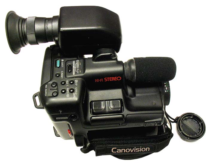 Přestože videokamer s oddělenou snímací a záznamovou částí (videorekordérem přes rameno) byla celá řada, přehoupněme se přes ně jedním z (pro nás) nejjednodušeji dostupných modelů, tedy co se fyzické hmatatelnosti týká. Canon VC-20 coby velký tzv. ramenní přístroj (208x218x331 mm a 2.5kg) je osazen snímačem SATICON, čB-hledáčkem, na tehdejší dobu vcelku dost výkonným objektivem s 8násobným přiblížením a zvláštním teleskopickým mikrofonem; a jak bylo v těch dobách celkem často zvykem, mnohé součásti se daly rozpojit nebo připojit jako stavebnice. Držení zápěstním řemínkem vpravo před objektivem obsahuje i ovládání transfokátoru, podobně jak to má uspořádáno další vyobrazený typ VM-E1. Tento první Canovision8, coby jakýsi napůl ramenní stroj s demontovatelným madlem k přenášení už má - přes své míry (143x149x333 mm a 1.980g) - evidentně velmi podobné tvary s běžnějšími videokamerami a i výbava by mohla být dnešním fandům oboru srozumitelnější. Půlpalcový snímač, automatické i ruční řízení ostření a ZOOM-u (6x), manuální řízení clony, zatmívačka (FADE) nebo LP-režim a další vymoženosti tohoto BIG-stroje budiž důkazy předchozího tvrzení…