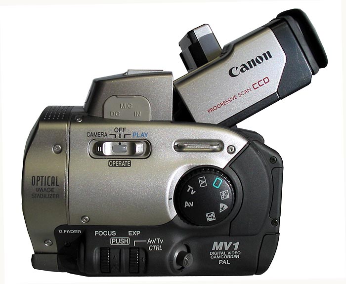 V pomyslném šuplíčku nám zbývá ještě první digitální přístroj mini-DV firmy Canon, tedy vyspělý, ale spíše fotoaparát připomínající, typ MV1. Třetinový CCD-čip s 380.000 pixel, optický stabilizátor obrazu, 14násobný optický a 35x digitální ZOOM, solidní 0,55" barevný hledáček nebo dvoupalcový vzhůru výklopný LCD-panel jsou opět úvodními charakteristikami tohoto velezajímavého stroje. Pro srovnání fanouškům našeho oboru jsme MV1čku vyfotili i vedle současných modelů, z nichž zejména efektní porovnání velikostí vedle v současnosti (možná) nejlepšího jednočipu světa mini-DV - Canon MVX3i - nám naznačuje mnohé. Ono při rozměrech 138x106x133 mm a hmotnosti 930gramů nešlo zjevně o žádné tintítko. A protože je tu ještě kousek místa před zakončením prvního poprázdninového rozjímání, zopakujme ještě z jiného článku snímky všech digitálních prvotin konkurence. Prvními maloobchodními mini-DV vůbec byly už v r.1995 Sony DCR-VX1000 a VX700, Panasonic se uvedl v roce 1996 hned svým prvním digitálním tříčipem NV-DX1 a JVC zase prvním jaksi už takřka dlaňovým přístrojem GR-DV1. A první ze všech digitálních Canonů MV1 už jsme probrali dostatečně…