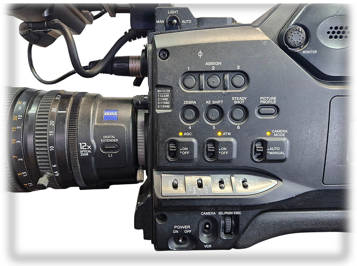Osazení vévodí tři snímače 1/3“ s celkem 1,12MPx na každém, k nimž přivádí obraz Objektiv (kopíruji celý název) Názorný detail přední části Videokamery a objektivu...Carl ZeissVario-SonnarT* s 12násobným přiblížením, třemi prstenci (!) manuálů a nepřehlédnutelnou sluneční clonou s dvojitým mechanismem „vrat“ - coby krytkou s páčkou na levoboku. Výklopný displej sice vyhlíží jako amatérská sranda na „převlečených“ kamerách typu HDR-HD1000, ale obrovitý tubus hledáčku vše usměrní na správnou mez. Na levoboku se po zaučení levička obsluhujícího hračičky může dosyta vyřádit, což snad „diváci“ z obrázků dokážou snadno odezírat. Mnohé čtenáře v mládí taky bavilo ovládat bagr, že…