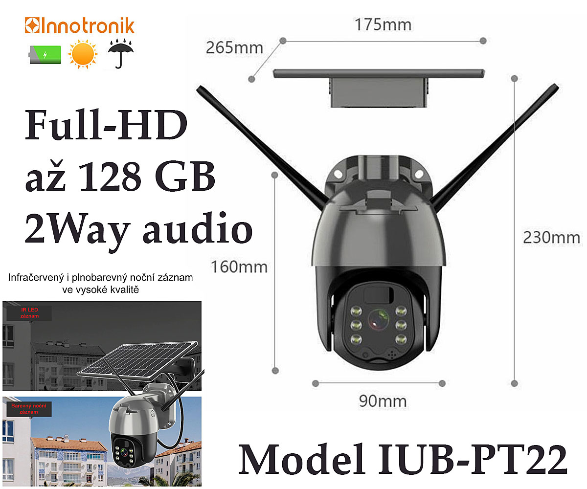 Přecházíme na vyšší úroveň: tedy STROJE, které mohou svou hlídací službu „kroutit“ mimo civilizaci a tedy nezávisle INNOTRONIK IUB-PT22 se nabízí v černé i bílé barvě...k blízké bezdrátové Wi-Fi. Z celkem DVANÁCTI modelů, z nichž mi bylo k recenzi půjčeno většinových SEDM, mají 4G čili SIM pouhé 4 typy. Nemyslím ale, že slůvko „pouhé“ musí být použito: podmínka až tak nezávislého užití je natolik specifická, že by 4 modely měly stačit v nabídce bohatě. Zvlášť když máme jak pevný typ pod 5 tisíc, s názvem IUB-BC22-4G (s tím jsem si vyhrál hodně - viz níže), tak i „půlkulaté“ obry IUB-BC20-4G, a ICH-BC23-4G - s rotační hlavou a pevným panelem - a IUB-PT22-4G s možností umístit solární panel až 1,4 metru daleko od kamery. Ceny pod odkazy…