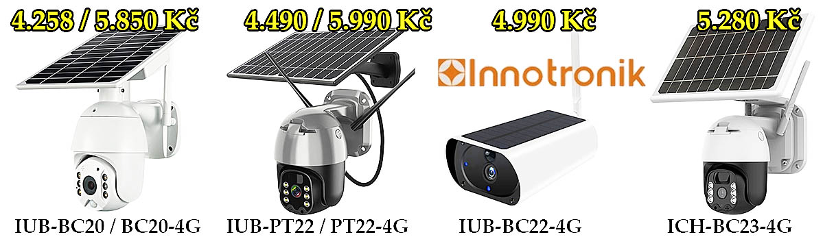 Třetím modelem, pro který je společná s předchozími aplikace CamHipro, je tvarově i funkčně značně odlišná Malá, lehká, ale VELMI výkonná: Innotronik ICH-BC22Dvaadvacítka neboli ICH-BC22. Shodný senzor s předchozí Jednadvacítkou, stejně jako karty až do 128GB. Shodně jako u prvního typu „jen“ IR-přísvit a shodně s oběma oboustranná audio komunikace. HLAVNÍ odlišností je možnost umístění solárního panelu hodně „jinam“ neboli mimo kameru; a to pomocí přívodního kabelu 3,5m. Kamerka má bez držáku jen 87x67x55 mm a 210 gramů, takže v podstatě prcek, ale samotný panel už zabírá v krabici více místa 180x155x15mm a 370gramů včetně kabelu. Aku opět 18650 a na dvě to prý vydrží. Cena „jen“ 2.790 Kč…