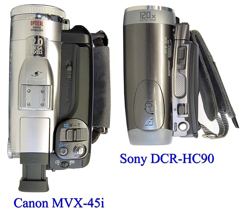 Duo videokamer Canon MVX40/45i. Spojení několika žádaných pojmů dneška s uznávanou (!) veličinou moderních videokamer, ale i digitálních fotoaparátů: optickým stabilizátorem obrazu. Duo poměrně maličkých videokamer vychází svým tělem i uspořádáním z předchozí úspěšné dvojice MVX20i/25i (R). I když jsem použil zdrobnělinu o údaji velikostí, nejde tu ve srovnání s konkurencí o žádná tintítka: s rozměry 70 x 82 x 133 mm a hmotností 530 gramů stojí oproti takové Sony HC90 (R) - 66 x 91 x 110 mm a 440g - nebo Panasonic-u GS75 (R) - ten má 76 x 77 x 120 mm a 420 gramů - jako malý obřík (přiložené srovnávací obrázky snad dostatečně napoví), i když jak v kterém rozměru. A pro jednoduchost formulací v dalším textu budeme recenzované duo "oslovovat" pouze v jednotném čísle, s vyjmenováváním rozdílů obou krasavic. V úvodu popisu ještě dodejme, že objektiv (O) značky Canon má Ø34mm, koeficient transfokátoru je 14násobný (MVX40 má pak jen 10x), f1,8; ohniskové vzdálenosti mají rozsah 4,6-64,4 (MVX40 4,6-46) a často žádaný tzv. přepočet na kinofilm je: 39,9-559 (39,9-399) na pásku a 37,6-526 (37,6-376) na kartu…