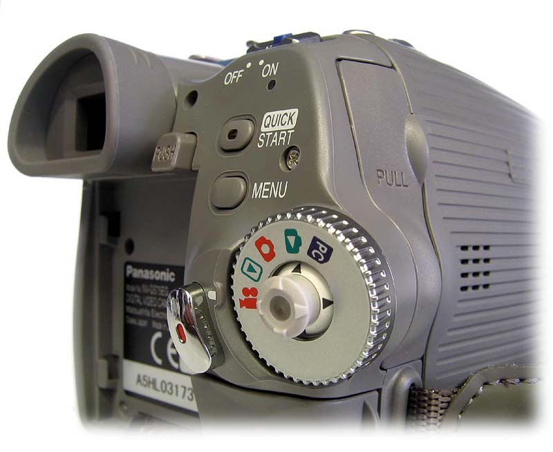 Hlavní vypínač umožňuje přímou volbu (!) režimů kamery, což je podle recenzenta praktičtější nejméně o řád oproti postupnému přepínání (O) Sony anebo zapnutí do předvoleného režimu velkým kolečkem (O), kdy mýlka volby se přímo nabízí (Panasonic). Navíc tento systém hlavního voliče vykazuje zjevně jinou (lepší?) ergonomii, než umístění posuvného přepínače u JVC (O). Nahrávací tlačítko je akorát a oproti kolegou kritizované slonovině (O) u MV880X (R) je ve stříbrné barvě. Horní prvky (O) ovládání padnou na správné prsty a na souhru ukazováčku s prostředníkem není potřeba ani příliš dlouhého zaučení: transfokátor lze pak ovládat právě nejdelším prstem, zatímco první prst (doktoři to tuším mají ještě o číslo jinak, kvůli palci) může fotit, přepínat mezi ukládáním na kartu a pásku a můj se naučil (ukazováček, dámy... :-D) boční ploškou zapínat i přisvětlující LED-lampičku (O), mimochodem dosti účinnou. K bezvýhradné pochvale ovládání chybí vyvedení tlačítka vstupu do hlavní nabídky mimo LCD-panel, i když toto MENU lze - s notnou dávkou opatrnosti - nahmatat s mírně vyklopeným (tj. nerozsvíceným) displejem, nejlépe s přidržením (přiskřípnutím) levičkou: je prvním na ráně…