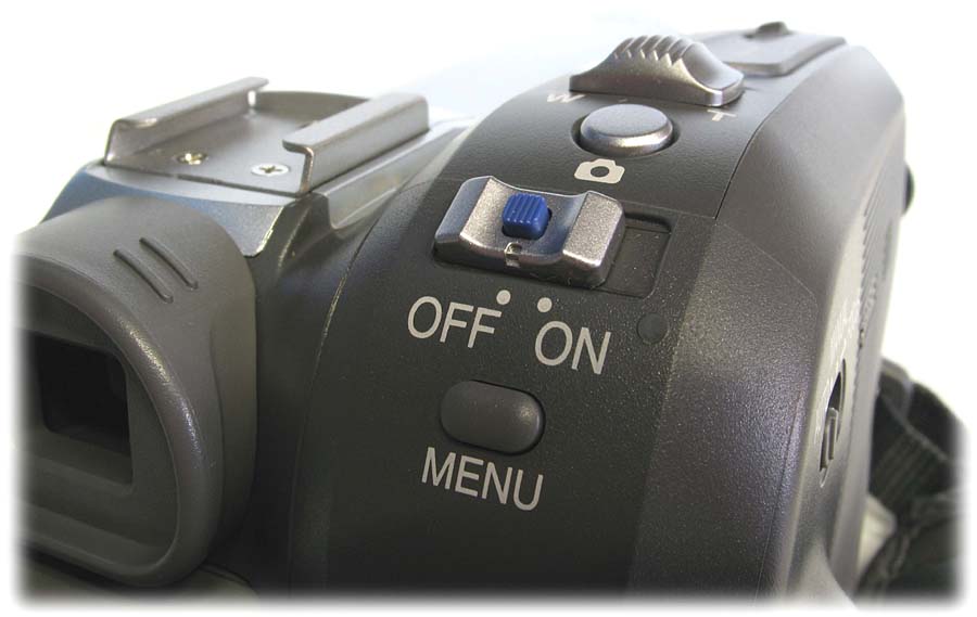 Dlužno dodat, že kamera nenabízí ukládání fotky na paměovou kartu, takže se snímek uloží po dobu 5-ti vteřin na pásek - tedy se trochu plete do běžného záznamu - a jeho kvalita je srovnatelná s videonahrávkou, tedy 720x576 (DV PAL). U předešlé modelové řady byl volič automatického a manuálního režimu umístěn pod výklopným panelem. Na novém modelu se přestěhoval na pravou část těla, takže je zhruba v části, kde ho zakrývá při běžném držení kamery kloub ukazováku. Na tomto prvku je i možnost aktivace manuálního ostření, které se pak ovládá pomocí joysticku, tedy palcem pravé ruky. Jiné ovladače již není třeba hledat, snad ještě kromě tlačítka RESET, které vrátí nastavení kamery do tzv. továrního. Tím je tedy vcelku jasné, že většina parametrů se nastavuje pomocí joysticku a menu. Kromě přepínače režimu AUTO/MANUAL se dá vše v podstatě ovládat pouze pravou rukou a ergonomie přístroje je velmi zdařilá, pravděpodobně to bude i (na spotřebku) trochu větším rozměrem samotného těla...
