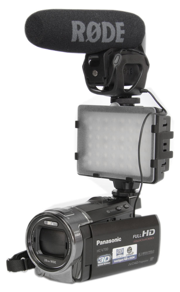 Ošacena videokamera HC-V700 ó LED světlo a videomikrofon (Kliknutí zvětší)Kvalita samotného záznamu je při využití nejvyššího možného módu 1920×1080 a 50p na velmi vysoké úrovni. Při dobrém osvětlení scény ostrost a detaily obrazu doslova nadchnou, stejně tak potěší velmi zajímavá šířka záběru (výše zmíněných 28 mm v přepočtu na kinofilm). Oba tyto klady HC-V700 se daly očekávat, zvědaví jsme však byli hlavně na záznam v nízkém osvětlení. Ani zde Panasonic nezklamal. V porovnání s řadou kamer Canon Legria HF M5..., kterou řadíme v této cenové ("nižší-střední") kategorii na úplný vrchol, co se týče citlivosti na světlo, sice „HáCéVé-sedmistovka“ stále trochu zaostává (drobnou demonstraci naznačuje i naše Galerie hned o další odstavec níže), ale rozhodně se za kvalitu nemusí v japonských továrnách pana Konosuke Matsushity stydět...