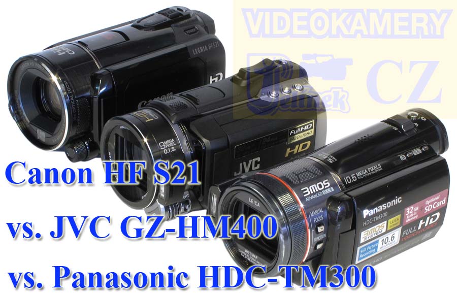 Panasonic SD700 a Canon HF S21 zepředu (Kliknutí zvětší)Technické parametry jsem výše asi kapku zkrátil, doplňme to. Solidně vyhlížející objektiv má průměr závitu 46 mm (shodně s HM400, CX550 má 37 mm a HF S21 pak 58 mm). Výklopný LCD-panel má 3" a přibližně 230kPx (HM400 má 2,8" s 207kPx a HF S21 shodně s CX550 se chlubí 3,5" a 922kPx). Hledáček je u SD700 0,27" velký a má 123kPx, u HM400 (jak bylo zmíněno již výše) zcela chybí a HF S21 má 0,27" a 123kPx, zatímco CX550 se pyšní na 0,2" rozlišením 201,6kPx. Co se týká nastavení kvalitativního stupně videozáznamu, tady relativní prohra SD700 září nejvíce: má maximum "pouze" 17Mbps, zatímco všechny tři další značky, jež jsem si vzal do srovnávání, disponují 24Mbps. Doplnění v srpnu 2010: ano, tohle tu mělo být HNED: SD700 umí progresiv 50p s tokem 28Mbps. Zmíním se o tom více v porovnání. častým dotazům do naší firmy (ale i do mé @-schránky) na rychlost paměových karet opakuji, že pokud má karta na sobě údaj 15MB/s, dokáže zaznamenat teoreticky asi osmkrát větší číslo datového toku. Jinými slovy: je-li 1 B (tj. jeden Bajt) 8 b (osm bitů), pak datový tok 24megabitů za vteřinu podělím osmi a dostanu objem dat za každou vteřinu s tolerancí nárůstu o zvukovou stopu a další data; a vypočtu tak zhruba 3MB za každou vteřinu videa (TřI MEGABAJTY), z čehož vyplývá, že karta s údajem o zápisu (i čtení) 15MB/s má JISTě obří rezervu (matematicky zhruba 5tinásobnou) k záznamu takového toku AVCHD, kapišto…