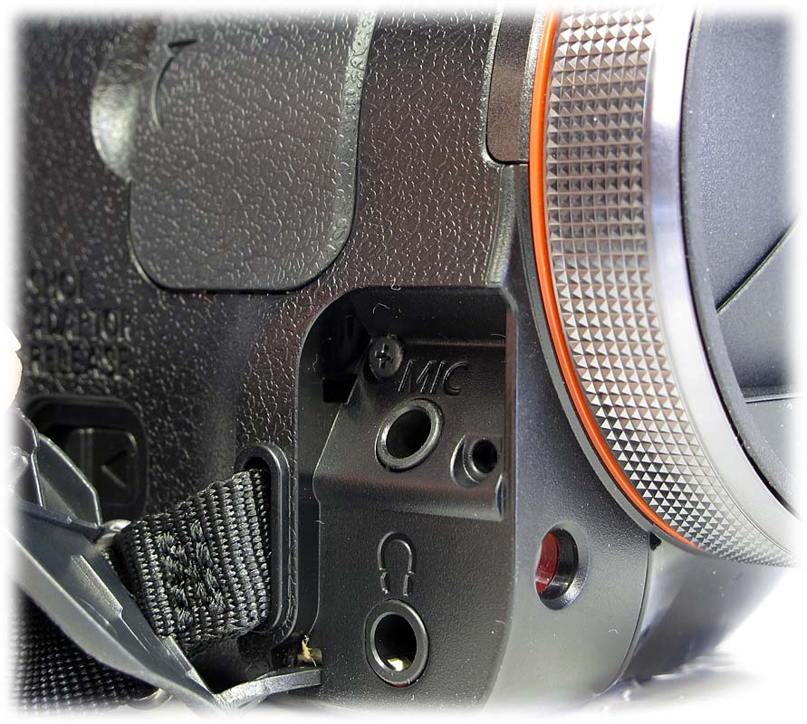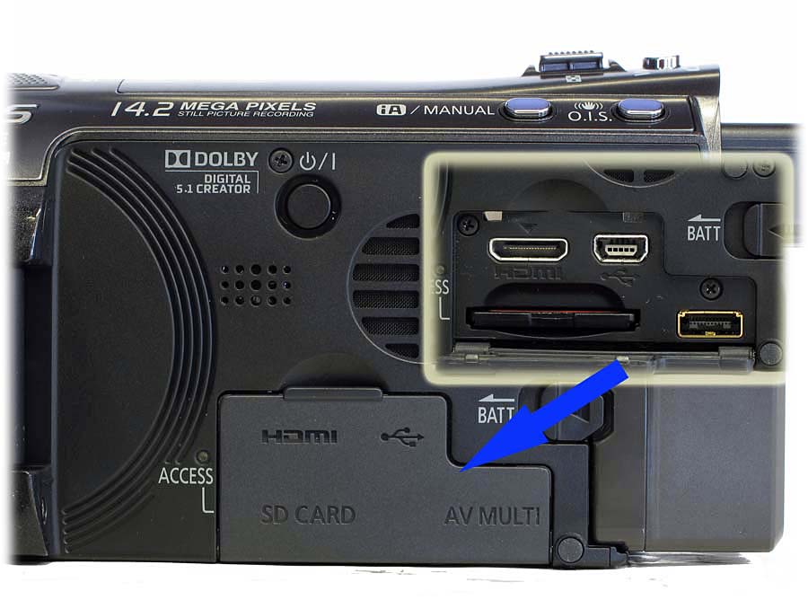 Panasonic HDC-SD700: detail přípojek (Kliknutí zvětší)Dotykový displej k ovládání většiny všech manuálů je dnes už natolik profláknutý, že o jeho (ne)vhodnosti na kamerách raději ani nezačnu polemiku. Manuálů má tato kráska vyvedeno na tělo tak málo, jak to mívá i současná konkurence v této cenové a výkonnostní kategorii. Na dolním okraji rámečku výklopného LCD jsou vstupy do MENU, druhé ovládání transfokátoru (myslím-li tím prvním horní pro pravý ukazovák nebo prostředník), druhá video-spouš (tou první opět myslím stříbrný oválek pro pravý palec) a symbol k odstranění dat (koš). Na levé straně nad okrajem (zavřeného) displeje je dvojice tlačítek iA/MANUAL (volba manuálů nebo režimu z tzv. inteligentních programů) a O.I.S. (stabilizátor). Inventuru tlačítek uzavřeme obdélníčkem CAMERA FUNCTION vpředu na válci objektivu (obdoba volby ručního řízení zmíněného iA), foto-spouští za horním transfokátorem a netlačítkovým prvkem důležitého multifunkčního prstence řízení manuálů coby rýhované obruby objektivu. K předchozí kritice stránek českého centra Panasonic si přidám několik dílčích zděšení z veřejně dostupného návodu pro SD700, kde se dezorientacemi a dezinformacemi fakt nešetří (měli by tvořit střízlivější :-D)…