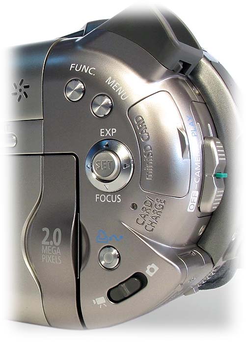 Další horkou novinkou je u DVD-dua dotykový LCD panel. NE, to si samozřejmě dělám legraci. Kamera je poseta mnoha tlačítky, které ponejvíce okupují levou část přístroje. Zde nalezneme nad výklopným panelem čtveřici tlačítek prvků pro přehrávání, v nahrávacím režimu pak tato slouží například pro zapnutí lampičky (pouze u modelu DC20) nebo aktivování námi zvoleného digitálního efektu. Pod LCD panelem jsou ukryta tlačítka pro finalizaci disku FINALIZE, dále pak tlačítko DISPLAY (v přehrávacím režimu umožní vyobrazení dat a času pořízení nahrávky), BACKLIGHT a WIDE SCR (volba režimu 16:9). Za elcédéčkem jsou pak tlačítka MENU, FUNC. (k nim se ještě vrátím) a hlavně je zde zmiňovaný multifunkční joystick. Ve spodní části se uvelebil přepínač nahrávacího režimu na DVD disk nebo fotografického režimu i na vcelku dosti speciální mini-SD kartu. Myslím, že Canon je asi i prvním výrobcem, který ve videokamerách toto médium používá: nemýlím-li se, dosud jsme m-SD většinou znali jen z mobilních telefonů…