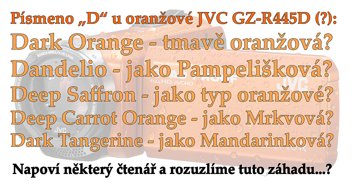 HÁDANKA k označení oranžové verze JVC GZ-R445D...Mysleli jste si, že POVÍDÁNÍ je KONEC (já taky Nevinný), že...? OMYL, ještě "kúsčik", jak říkajů kluci na východě Moravy a ještě o ždibec dál. Přidávám prosbu pro diváky (pardon, čtenáře): kdo bude vědět, proč oranžová verze má označení nikoli "O", ale právě "D" z produktových dat, pomůže rozluštit hádanku. Není to na odměnu (jistě nějakou vymyslím), ale mnohem spíše na koronoavirové rozjímání, kdy využíváme čas, kterého je teď poněkud nečekaně VÍCE. Předpokládám, že mi moji čtenáři rozumí. HOWG. PJ.