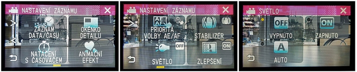 Otevřu LCD-panel (celé trio shodně 3,0“ a 230kPx - viz tabulka z recenze CX240) a mašinka zapne. Tady sice chybí možnost kontrol paměťovky či nutnosti utření displeje před odchodem do terénu bez zapnutí kamery, ale budiž. Protože u konkurentek musím stejně vytáhnout (odejmout) akumulátor, ať se nezapnou, necháme to koňovi, on má přece jenom větší hlavu. Mrkající Dotykový displej funguje udatně a odolnost „proti všemu“ na jeho funkci nemá vliv. Pod pravou dolní ikonou najdu volbu jazyka a pak už je všechno intuitivní jako u konkurentek a dá se zmáknout i bez návodu. Vývojářům asi radil někdo od nás (z ČR i oboru), protože Čeština tu není zmatená…
