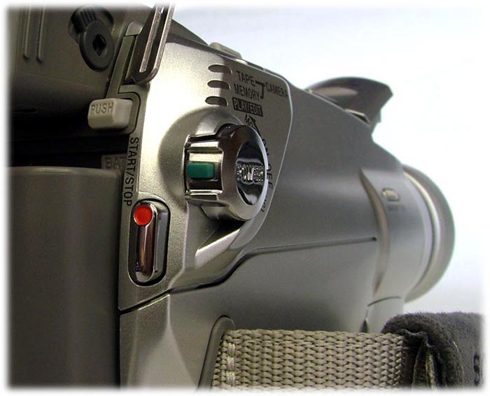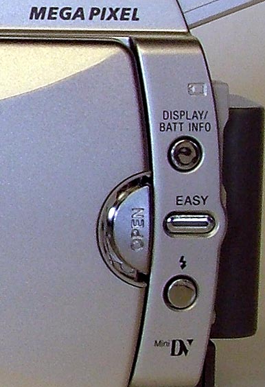 Na těle videokamery - kromě základních ovládacích prvků podle obrázků jako je POWER ON/OFF nebo START/STOP tlačítko nahrávání - najdeme i tlačítka pro volbu manuálního ostření (přístroj má ostřící prstenec kolem objektivu - viz obrázek); BACKLIGHT - což znamená vlastně jakési skokové přednastavení expozice při natáčení proti zdroji světla; DISPLAY/BATT INFO - tlačítko pro vyobrazení průběhu stavu nabíjení; EASY (EASY HANDYCAM) - přístroj si nastaví většinu funkcí do tzv. plné automatiky a nabídka MENU se výrazně zjednoduší. Dále je tu přepínač nočního natáčení (u Sony realizováno přisvícením infračervenou LED-diodou) a pokud jsem na nic nezapomněl, posledním tlačítkem by měl být přepínač-volič nastavení režimu blesku těsně za LCD-panelem, jenž je stejně jako předchozí vyjmenované prvky snad dobře patrný z našich přiložených obrázků…