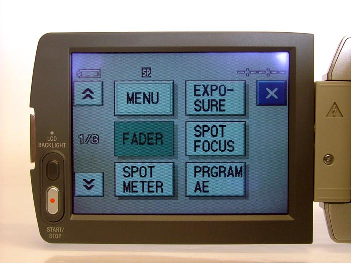 Pro natáčení a ještě spíše k přehrávání máme k dispozici ke kontrole záběrů výklopný a velmi přehledný 3,5“ (úhlopříčně) velký LCD panel s rozlišením 560x220 (tj. 123 200 bodů) anebo také barevný hledáček se shodným počtem obrazových bodů. Ten naštěstí JE možno nastavit ve vertikální poloze. Sony se i pro tento rok rozhodla obdařit své přístroje dotykovým LCD-panelem a většinu funkcí je potřeba nastavit právě přes tento "dotykáč", ale naštěstí je na nových panelech vidět i za slunečného dne oproti loňským modelům mnohem více a povrch LCD je vybaven speciální vrstvou, na které nejsou tak výrazné daktyloskopické stopy od prstů. Problém však stále zůstává v celkem pomalém a nepohodlném vybírání funkcí v MENU anebo nastavení a aktivování přechodových efektů. Před natáčením by se tento nedostatek dal ještě tolerovat, ale pro ukončení záběru je třeba čtyřikrát "uknout" do LCD-čka a to není vždy pohodlně možné. Navíc každý dotek, zvl᚝ při větším přiblížení, znamená pohyb s kamerou - a s nutným vyklopením LCD - a pak tedy rozhodně nejde o nijak příjemný jev. Na druhou stranu je pravděpodobné, že mnoho uživatelů bude chtít doplňovat přechody a efekty až v domácím PC, takže jim tento nedostatek na jinak vcelku povedeném přístroji nemusí tolik vadit…