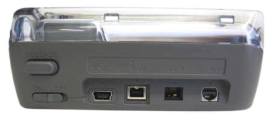 Konektory a propojení Sony DCR-PC55. Jak už bylo řečeno výše, popisovaný trpaslík má ve výbavě přiloženu tzv. dokovací stanici, na níž najde uživatel vše potřebné. Odezírejme z obrázku: vedle mechanické odjišovací západky RELEASE je zde vypínač kolébky ON-OFF a kromě hlavního přípojného konektoru do přístroje (ten je nahoře) pak čtveřice potřebných zásuvek. Zleva je to tedy USB, IEEE1394 (u Sony i-LINK), napájení kamery DC IN a velmi speciální (!) - a naprosto nekompatibilní s jinými než originálními kabely (např. po ztrátě káblíku) - zásuvka mnohonásobného konektoru analogového výstupu/vstupu A/V. Přístroj samotný pak poskytuje na pravé straně svého minitěla alespoň tuto A/V-zdířku a možnost napájení. Snímek s detailem konektorů na vlastním přístroji ukazuje i složitější podlouhlý konektor pro nejkompletnější propojení se zmiňovanou dokovací staničkou. Připomínáme raději zas a znovu, že všechny naše obrázky jsou už třetím rokem vybaveny popiskami - o co jde (podržení PC-myškou) - a taktéž možností jejich zvětšení (kliknout); zhruba na velikost do rozměrů kterékoli ze stran 800x600 (málokdy více)…