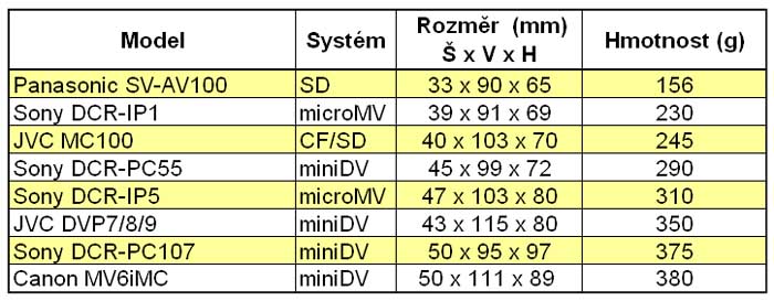 Vzhůru k popisu samotné mašinky! Videokamera (snese-li vůbec tento mini-prcek takové označení) Sony DCR-PC55 (čs. WEB) tvoří zřejmě dvojici s o kousíček levnější a minimálně odlišnou kolegyní PC53 (český WEB) a dodává se ve stříbrné nebo černé barvě. Nepopiratelnou eleganci obou provedení zde naznačují i srovnávací fota, kde jsou obě barevné varianty vedle sebe - pro porovnání. Jiným a představě čtenáře snad taktéž účelným porovnáváním by mohla být v nedávné aktualitě zveřejněná fota PC55 vedle donedávna světově nejmenších konkurentek (2x recenze) Canon MV6iMC a JVC GR-DVP7-9: snímky zboku a zezadu. Zopakujme si srovnání velikostí a hmotností, jež jsme pro lepší přehled zakomponovali do naší malé tabulky. Oproti MV6iMC a DVP7 je tedy novinka opravdu nejmenší, i když některé rozměry PC55 mohly být podle mého názoru výrazně jiné (viz dále). Přehled rozměrů a hmotností obsahuje i několik dalších modelů v čele s nejmenší páskovou videokamerou vůbec, tj. microMV IP1 a taktéž kartovou AV100. No a zmíněná tabulka existuje proto, že to editorovi těchto stránek (autorovi textu) připadalo jednoduše zajímavé…
