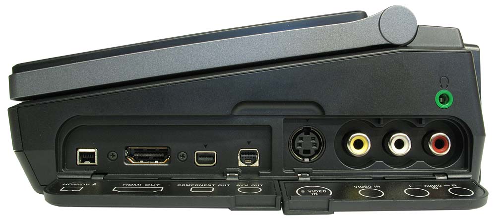 Sony GV-HD700: konektory na pravé straně (Kliknutí zvětší)Boční deklíčky na pravoboku (= vpravo při pohledu na přístroj zepředu) ukrývají většinu přípojných zdířek. První je sice nad krytkami (zelená sluchátková), ale ostatní se odhalí až po vyklopení pomocí výstupků na společné prohlubni podlouhlých krytek s malými pantíky. Zleva je zde tedy digitální rozhraní HD/HDV (tuhle mi jeden pisatel sděloval do E-mailu obavu, že jím neproleze plné rozlišení, ale že na to musí mít HDMI: NEMUSÍ) a pokračujeme běžným tvarem - čili nikoli speciální mini-verzí - HDMI portu (už jsem druhdy uváděl, že jde o zkratku High Definition Multimedia Interface). Ještě více vpravo je COMPONENT OUT pro přenos nejvyšší kvality (tedy i do přístrojů bez HDMI) a poslední dírku pod první krytkou představuje (bohužel!?) speciální uspořádání analogového výstupu A/V OUT - a pravda hned mezi dalšími přípojkami doplněnou klasičtějšími zdířkami typu CINCH: tady ovšem nutno poznamenat, že barevné verze zdířek jsou deklarovány jako vstupní (IN) a milovníkům propojení jasových a barvonosných složek signálu extra nabízí Sony ještě před nimi (čteme zleva) S-Video IN. Komu chybí ve výčtu 2 životně NUTNÉ zdířky, rychle se uklidní: klasický USB port i napájecí zdířka DC IN jsou zezadu vedle akumulátoru…