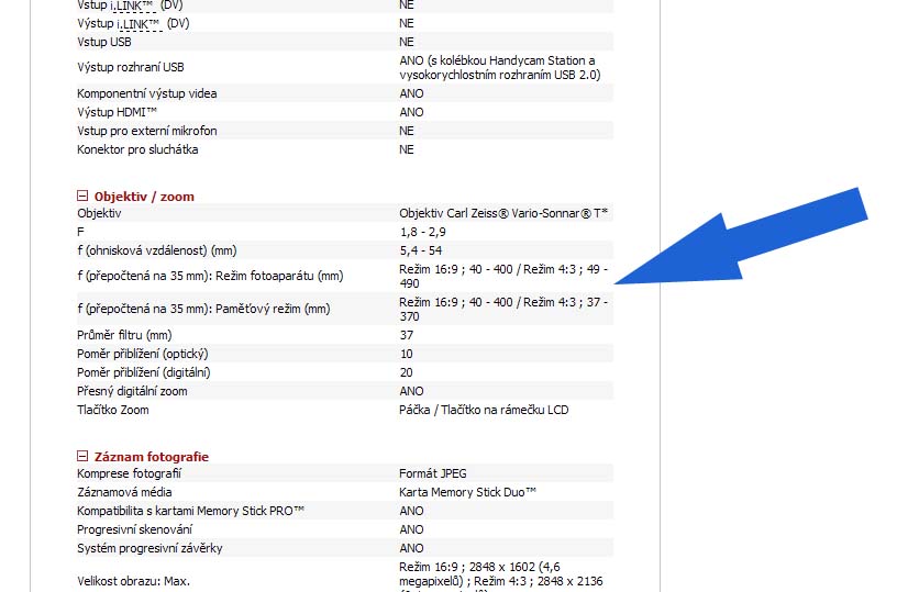 Technické parametry videokamery Sony HDR-CX6: české stránky producenta..