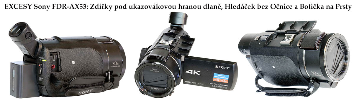 ERGONOMIE. Oba stroje mají patřičně jednoduše DOKONALOU shodu držení, i s dosahem všech prvků standardní Videokamera Sony FDR-AX53 z levoboku v perspektivě„běžnou“ rukou kameramana. Mnohokrát jsem zmiňoval zkratku RJL, již znají častější čtenáři jako Ruce Jako Lopaty. Zjednodušeněji píšu, že každý CHLAP, který má prostě VELKOU ruku, si na moje doporučení nejdříve vyzkouší vybíranou mašinku někde s provlečením pravičky do zápěstního řemene a zjistí, na čem je: to u obou KOMPAKTNÍCH Videokamer. Stativové závity zespodu jsou kapku rozdílně umístěny, ale tady NENÍ problém. MASA „holých“ kamer: F1 má 69x77x167 mm a 450g, AX53 pak 73x82x161mm a 535g. F1 je skladnější do bundy, ale dám spíš půl Bodu za hmotnost. Skóre je 3,5:3,5…
