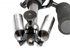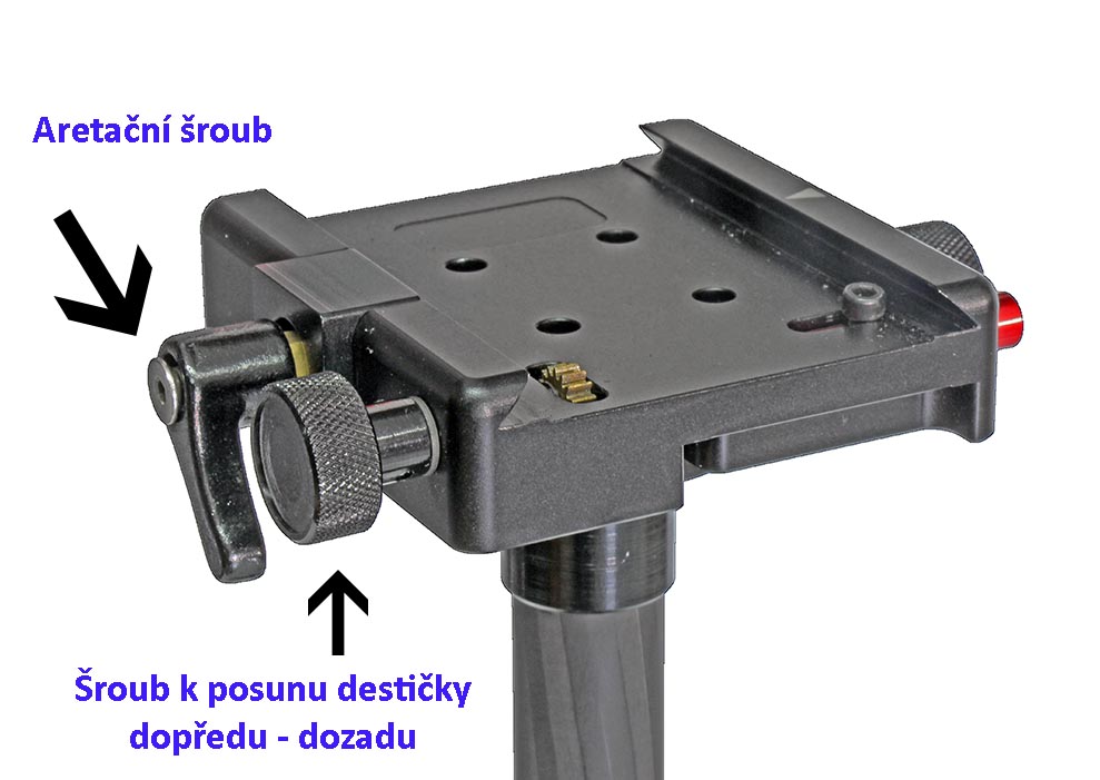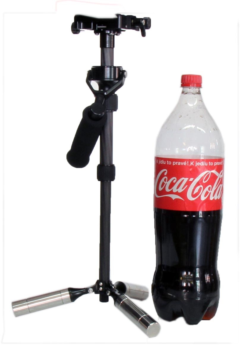 ) výšku a na trojnožku se našroubují válečky coby nožičky. Ty lze také volit kratší a delší, protože se skládají ze tří šroubovacích dílů. Namontovali jsme všechny. Dalším krokem mělo být vyvážení na rukojeti „naležato“, kdy trojnožka je na jedné straně a přístroj s hlavou na druhé: tak, aby obě strany zůstaly po správné aretaci ložiska s rukojetí uprostřed, tělo stabilizátoru ve vertikální poloze. Následuje vlastní vyvážení upevněného přístroje nahoře s nožičkami visícími dolů tak, aby se fotoaparát zklidnil v horní poloze a nikam se nekácel. Tohle už opravdu NENÍ nic jednoduchého a podle nás už VŮBEC NE na 60tivteřinový limit, jak jsme se někde dočetli…