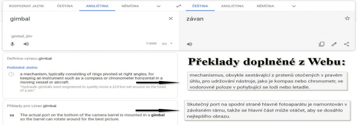 Odkazy na souvislá témata dnes nahradí povzdech. Autor knih o videokamerách, spolutvůrce mnoha názvosloví tohoto zákoutí elektronické specializace KRÁLOVNY SPOTŘEBNÍ ELEKTRONIKY; a mnoho let snad také viditelně snaživý fanoušek videa NECHCE nazývat Roba neboli Kapsičku Gimbalem! Ten podivný anglický paskvil nepasuje ani na jméno, ani na účel nebo funkčnost této maličkaté nádhery! Gimbal má být v angličtině cosi jako „Závan“, s vysvětlivkami na Webu Transalate.google.com (viz níže); a to je jen jeden z dalších důkazů, jakže si to naše české prostředí pohodlných „názvoslovářů“ umí už na vstupu prznit pojmy, pro něž by naše krásná řeč nepochybně našla trefné a přiléhavé názvy. Robo má zajisté spousty zvláštností, ať už svým tvarem, uspořádáním i funkcemi, ale NENÍ to ŽÁDNÝ „Gimbal“…!!! Mnohem spíše bych jej nazval v duchu originálního názvu „Kapesní reportážní videokamerou“ (Kamerkou?), s patřičnými zkráceními tohoto označení…
