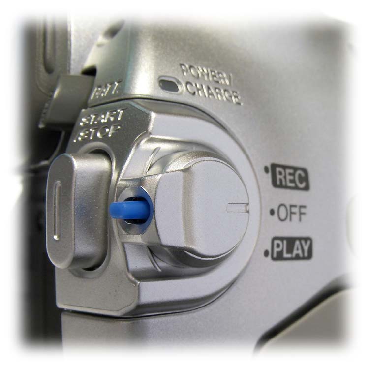 Velkou změnou je u nových typů hlavní vypínač, který se v různých obměnách používal snad již u všech výrobců a já jej považuji asi za nejzdařilejší typ. Má tři polohy (nahrávání, vypnuto, přehrávání) plus malé modré aretační tlačítko, které je nutno zmáčknout při přesouvání z vypnutého stavu. Vedle něj se pak nachází stříbrné nahrávací tlačítko s klasickou funkcí jednou zmáčknu nahrávám, podruhé zmáčknu a nahrávání jsem přerušil nebo ukončil. Na horní části kamery je posuvník ZOOM a tlačítko SNAP SHOT - foto spouš. Obraz je možné sledovat na 2,5" LCD panelu (112.000 bodů) nebo v barevném hledáčku. Ten má možnost korekce dioptrií a nechá se i kousek popotáhnout za okulár z kamery, nikoli však vyklopit nahoru, takže při zakoupení většího AKU nastává problém, jak vlastně do hledáčku dohlédnout, když nám baterka tlačí do tváře. Okulár je bohužel stejně jako u ostatních výrobců vyroben z "poctivého" plastu, jenž z boků nekryje dostatečně při natáčení za slunečného dne, takže boční světlo nám svítí do oka. LCD panel je vcelku čitelný, ale rozhodně nás připravuje o více energie z akumulátoru…