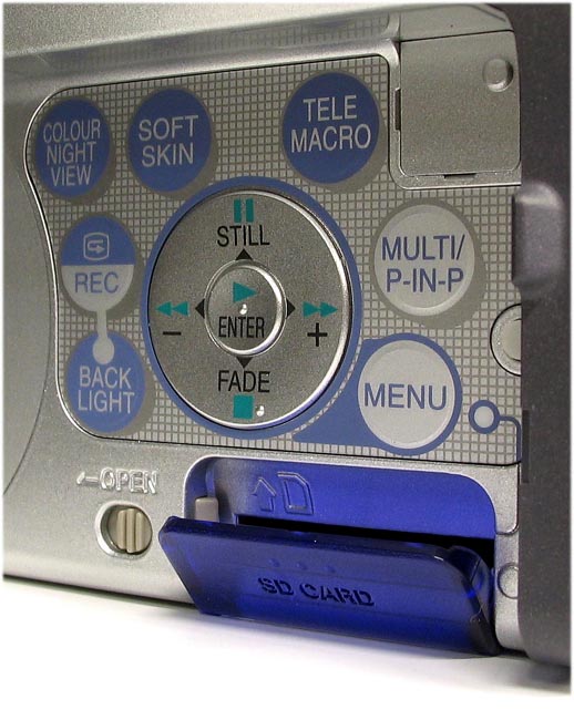 Kamera je také vybavena fotografickým režimem na paměovou kartu (je to přece moderní, že). Zaznamenávání statických snímků se tu děje na SD (případně MMC) kartu ve formátu JPEG, s maximem rozlišení 640×480 bodů (VGA). Na 2,5“ LCD displeji sice může taková fotka vypadat skvěle, nicméně na tisk raději zapomeňme, přestože je kamera vybavena standardem PICT BRIDGE pro přímý tisk fotografií. Navíc není k dispozici ani potřebný blesk. Na kartu, jejíž slot je dobře patrný z obrázku, lze rovněž zaznamenávat (velmi) komprimované video ve formátu MPEG 4 s rozlišením 320×240. Ani to ale není nic extrovního: ve výsledku jde pouze o dosti slabou ukázku toho, kudy se snad může ubírat budoucí vývoj v oblasti videokamer, respektive záznamových médií a formách ukládání pohyblivých obrázků…