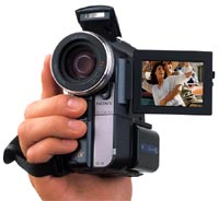 Typické držení dlaňovky: Canon MV5/6 (Klikni pro zvětšení) Tak co tedy? Naznačme ještě několik pohledů na dané téma a také na samotné modely videokamer. Amatér či skupina amatérů (například rodinka), jež nemají chu příliš utrácet, bude asi vybírat v kategorii nejnižší: řekněme v rozmezí 15-25 tisíc korun MOC. Jako možné stroje se budou jevit (abecedně)