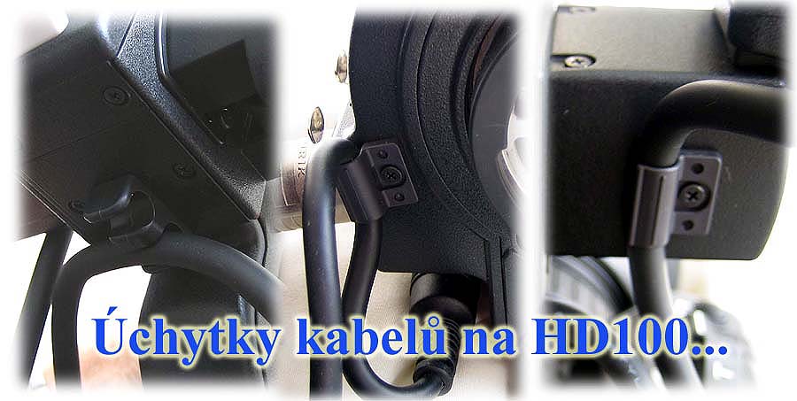 Tlačítka pro přehrávání záznamu jsou schována pod malou krytkou, kterou je nutno k jejich zpřístupnění posunout dopředu a odklopit. Ramenní opěrka je posuvná s mechanickou aretací asi o 5 centimetrů dozadu a podle našich zkoušení by měla takto vyhovovat každému. A ještě jsem nezmínil, že prstence manuálních funkcí jsou tu dokonce čtyři! Zepředu je to tedy široký jakýsi dvojkruh ostření, druhým je zde transfokátor s rozsahem 5,5-88 (ano, objektiv má 16násobný ZOOM), třetím je řízení clony s údaji na prstenci 1,4 až 16 a písmenkem "C" - do nějž vždy při vypnutí najede (že by CLOSE?) - a čtvrté je rýhované kolečko MACRO, které funguje po uvolnění aretace dozadu. Z poněkud jiného soudku jsou možnosti zvukových nastavení a XLR-připojení, ale taktéž zcela neamatérského ražení: do té věci se dá zjevně nahrávat zvuková stopa z externího zdroje nebo připojit jakýkoli exterňák, který bude na stroji kam připevnit anebo spočine ve spanilé ručce fešné moderátorky. A protože kamera HD100 má sloužit profíkům bez zájmu o plandající přípojky, na všechny kabely jsou tu úchytky (některé jsme sem vyfotili)…
