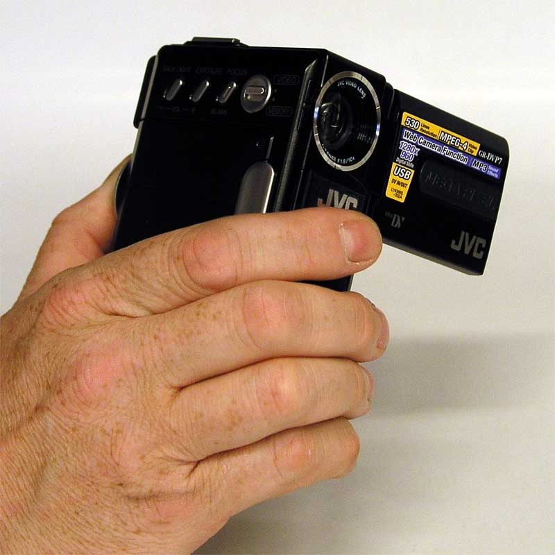 Povšimněme si, že zatímco například Sony PC-110 má vcelku podivný „otáčecí element“ pro opření malíčku, tak srovnatelný (ale vybavenější) Canon MVX2i „uchopí“ pravici jako celek za zápěstí a otočným kloubem zajišuje pevné držení a pohodlné ovládání. Naopak za vysloveně zvláštní si dovoluji označit způsoby držení, kdy u miniatury si musím pomoci levou rukou, abych vůbec přístroj zvládal! Tuhle „podivnost“ nalezneme určitě nejen u JVC, ale překvapivě i u věhlasného Sony - právě u modelu IP5 jsem měl docela problémy s miniaturizací „za každou cenu“. Pokud se nelekne čtenář někdejšího tvaru a obsahu článku (tenkrát jsme se teprve učili dělat WEB), tak v předloňském článečku o