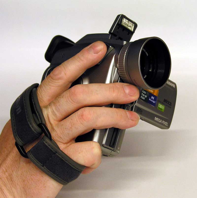 Nejlepší držení z nejmenších strojů bych si zase dovolil přiřadit firmě Canon: modely MV5/6 mají opravdu navrch naprosto zjevně - alespoň co se mini-rekordů týče. Zápěstní řemínek totiž obepíná opravdu pevně a solidně celý hřbet dlaně a pokud kameraman dodrží i rozhodně jednoduchou zásadu úchytu tří prstů na předním krytu a posunutí ukazováku na ovládání transfokátoru (ZOOM), pak těžko hledat lepší ergonomii kamery-dlaňovky...