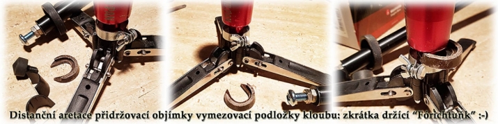 VÝROBA ARETACE. ..."jako na sviňu" jsem netušil nemožnost aretace dolní trojnožky. ANO, NESMÍ se na tom ponechávat zrcadlovka nebo profesionální kamera na louce bez dozoru, ale funguje to tak. Nejdříve jsem se poznal s trojnožkou tak, že jsem ji totálně rozebral (Jakube, promiň Nevinný), zhruba jako Samopal SA58 na vojně (v tom jsem býval velmi rychlý) - jak vidí čtenář na obrázcích. Po zjištění, že kulový konec je s hlavním tělem vínové barvy JEDEN kus a plastový mezikus se mi nepodaří odejmout - a místo něj nasadit jinou (odnímatelnou) vložku nebo podložku - jsem musel zapojit "konstrukční závity" šedé kůry mozkové (jsem poloviční konstruktér)... Úžasný