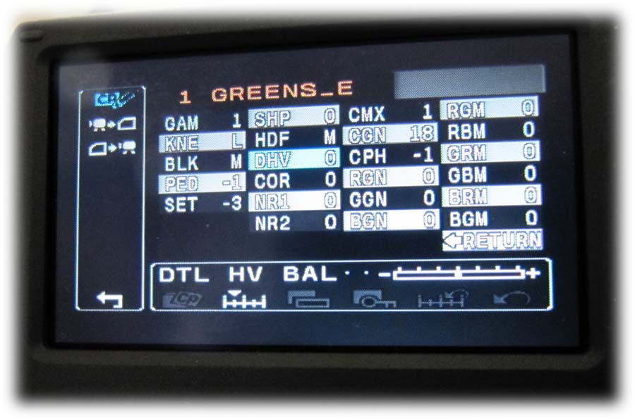 Detail nastavení na displeji XH A1/s (Kliknutí zvětší)CUSTOMIZE v MENU Canon XH A1/s coby CUSTOM PRESET (zkrame na CP) jednoho z bardů diskuse tu bylo, doplnění následuje. Minulý CP (cituji) mírně potlačuje detaily, což je vhodné např. při malém osvětlení (potlačí i šum) a vkládá nabroušený PRESET k maximu detailů. Rozdíl je v CMX, ColorGain (CGN) a v nastavení oněch detailů (HDF L, DHV 4). První CP má gama1, což "papá světlo" (obraz méně jasný, než s Gama normal). Takže pro LowLight využívá tento CP např. tam, kde není třeba +6dB (tam použije ostrý druhý CP, ale +12dBSrovnání: Canon XH A1 a XH A1s zezadu (Kliknutí zvětší) gain). Pokud se s 1. CP použije jen +6dB, obraz je tmavší, než s tím ostrým. Jinak: Gama 1 CP je především k "film look" (míň ostré nastavení a měkčí, méně kontrastní obraz) - nouzově lze použít i pro LowLight s +12dB gain - a Gama normal CP k maximu detailů. Pave1 či Správce podle sazebníku Ministerstva videokamer (:-D) vysvětlí (PJ)..