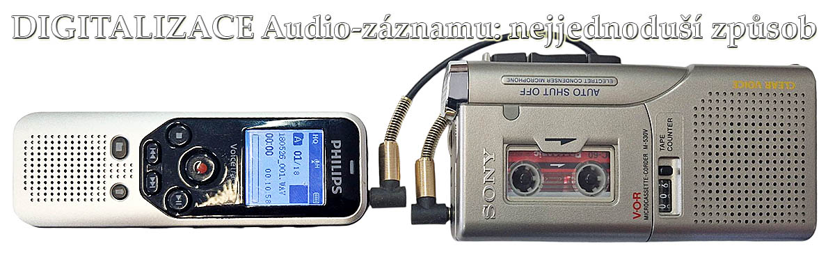 DIGITALIZACE audio-záznamů. Malý podíl zakázek ARCHIVACE u nás tvoří audio: tedy zvuková stopa Stará dobrá AUDIO-Klasika Devadesátek se opet vracína některé z pásek. Nejčastěji jde o magnetofonové kotouče nebo staré dobré kazety, na nichž bývají první slůvka ratolestí anebo důležité záznamy ze soukromé či firemní události. Nejjednodušší realizace tohoto převodu do digitální podoby je přehrávání zvukové stopy funkčním přístrojem na patřičné pásky s propojením do diktafonu: ten ukládá soubory (vesměs) ve formátu MP3. „Vysypání“ takových klipů ven z rekordéru do PC se děje buď čtením ve čtečce karet; nebo po připojení USB-kabelem - to třeba v případech, kdy použitý diktafon například nemá svůj slot na kartu…