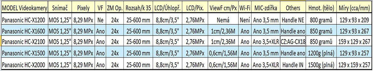 Tabulka údajů kamer Panasonic HC-X1200 až AG-CX18
