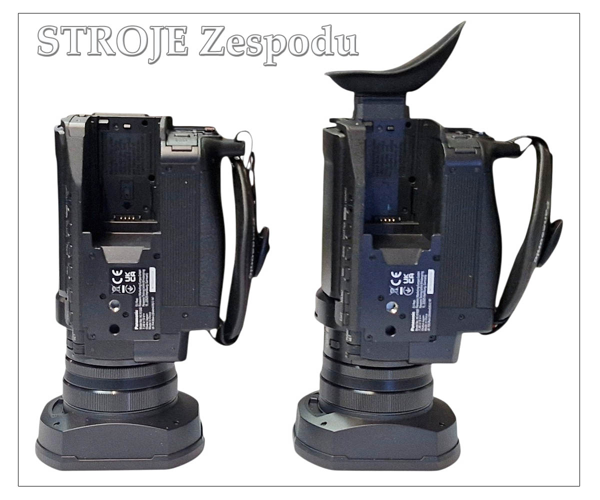 Ještě pár tlačítek směrem k zadní části těla a jdeme na stroj z jiných úhlů pohledu. IRIS neboli clona nechá obsluhu Videokamery Panasonic HC-X1200 a X1600 zespodu...volit ručně tento parametr. GAIN pak nechá omezit řízení automatického zisku na stupeň, který má uživatel vyzkoušený. SHUTTER řídí po aktivaci rychlost expozice: která má podle údajů má Webu výrobce a dle zvoleného módu rozsah 1/6 jako nejpomalejší a 1/8000 coby nejrychlejší. Posledním na levém dolním okraji šasi kamery je posuvný přepínač AUTO - MANU, jehož účel si dovoluji ponechat na důvtipu ctěného čtenáře. Mrkající Větší plocha pod vyklopeným LCD zde má dvířka pro dva SD-sloty a volbou jejich preference SLOT׀ SEL, vstup k přehrávání THUMBNAIL, volbu indikací na displeji DISP/MODE CHK, hlavní vypínač, volbu programů expozice AE LEVEL a nakonec i vstup do řízení balance bílé barvy WHITE BAL…