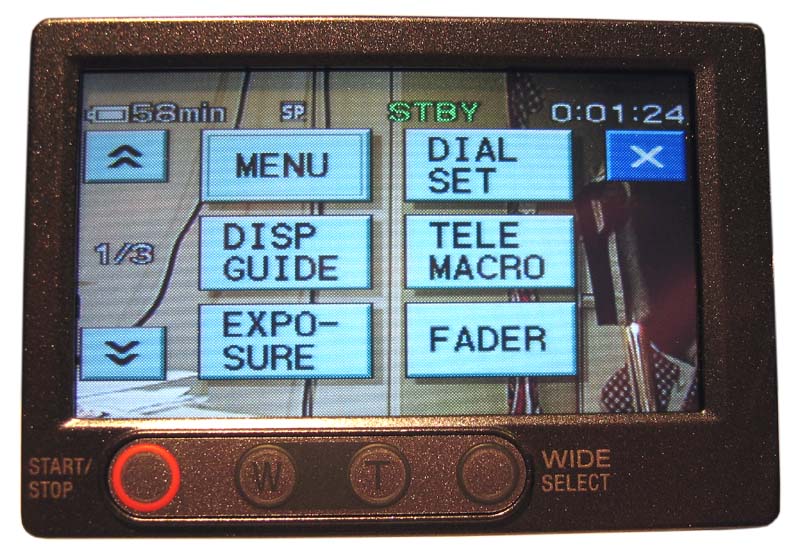 Vpředu nad pantem panelu je dvojice hejblátek zajímavých voleb: před tlačítkem manuálních funkcí je rolovací kolečko k jejich ovládání, jež může ovlivňovat ostření, expozici, bodovou expozici a tzv. bodovou balanci bílé barvy. Stlačením čudlíku MANUAL na (odhaduji tak) asi 3 vteřiny se objeví nabídka jmenovaných funkcí a po volbě kterékoli kamera napíše na displej např. AE SHIFT nebo EXPOSURE 1s set a opravdu za vteřinku je volba dokončena a tedy k použití. Podobně se sestava procesorů kamery chová po zvolení páté nabídnuté funkce, jíž je vlastně zrušení kterékoli z předchozích manuál-funkcí RESET a návrat na jakýsi pohotovostní stav. Tento základní mód totiž nechá vždy po stisknutí tlačítka MANUAL zvolit nebo vypnout jen režim ručního ostření s efektním ukazatelem stavu, jiné nabídky jsou indikovány opět po delším stisku zadního z obou prvků. Točítko jinak reguluje zvuk z vestavěného reproduktoru při přehrávání videa. A protože ovládací novinku považuje autor recenze za důležitou, pokusil se ji doprovodit názornými vyobrazeními (všechna ke zvětšení PC-myškou)…