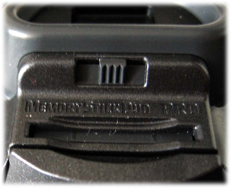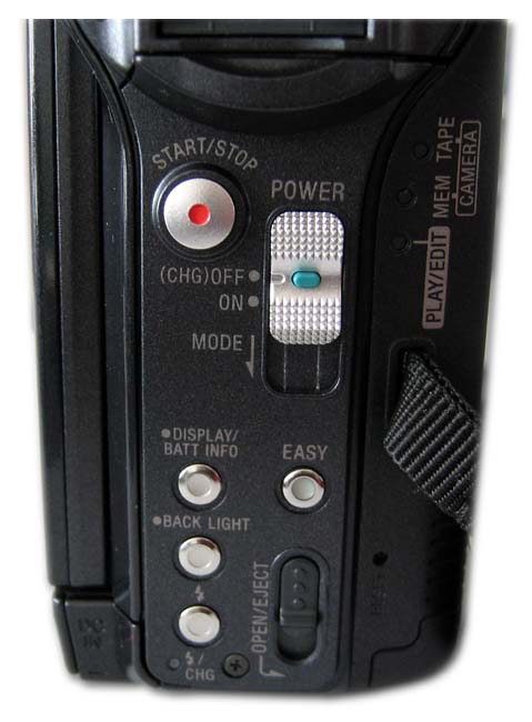 Slot paměové MS-DUO-karty je hned pod hledáčkem a jen několik milimetrů níže je video-spouš a hlavní vypínač (volič režimů). Ten zůstává (nejen?) pro mě neprakticky zdržujícím, protože s ním totiž nelze provést přímou volbu (např.) přehrávacího režimu, anóbrž je nutno nejprve postupně přejet z nahrávacího přes kartový mód a pak teprve umožní požadované. Inu, ještě že tyhle libůstky nevnucuje veliký Sony u dražších strojů typu VX2100 nebo FX1, tam už by takové uspořádání bylo vidět asi i na prodejnosti. Zadní strana stroje obsahuje ještě 4 (čtyři!) tlačítka, jichž jaksi model od modelu s dotykovými LCD-panely na přístrojích Sony přibývá. Je tu volba indikace displeje a stavu akumulátoru DISPLAY/BATT INFO, zařazení funkce tzv. protisvětla BACK LIGHT a nastavení režimů vestavěného mini-blesku. Zbývá tlačítko EASY s efektně modrou indikací takto zvoleného režimu, pravá kontrolka nabíjení AKU a mechanická posuvná páčka OPEN/EJECT pro nakládání kazety do mechaniky. Kontrolky právě zařazených módů přístroje na pravé straně nad řemínkovým úchytem a nulování stavů kamery do tzv. továrního nastavení - ďolíček RESET - jsou posledními prvky zadního dílu…