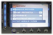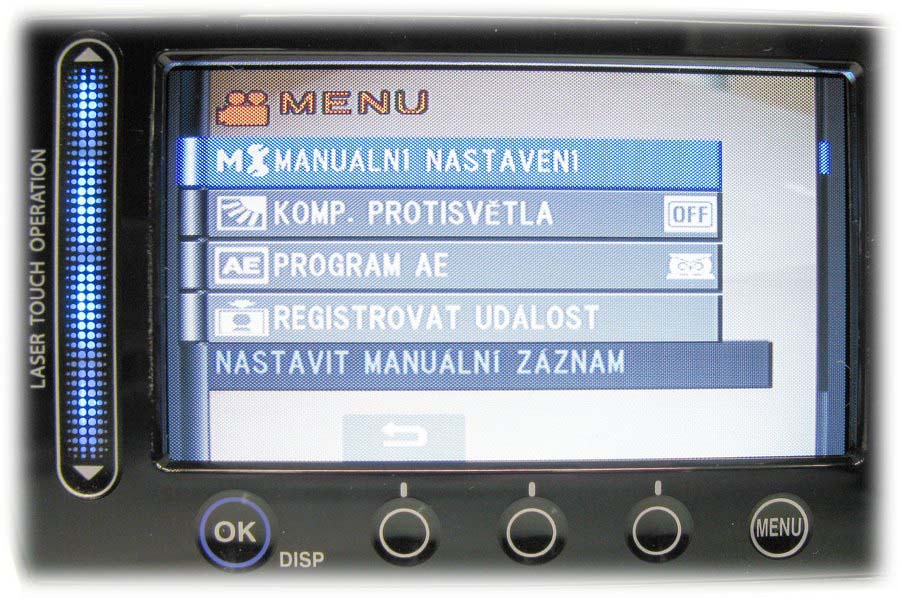Detail ovládání s otevřeným LCD (Klikni pro zvětšení)Originálním způsobem vyřešili u JVC ovládání funkcí a menu. Laserové dotykové ovládání je u kamer úplnou novinkou. Klasický joystick tady byl nahrazen světélkující lištou vedle displeje, která dovoluje pohyb nahoru-dolů. Dalších pět "tlačítek" se skrývá ještě pod LCD. Jedno pro potvrzení (OK), tři pro zvolení funkce zobrazené symbolem na displeji a tlačítko MENU. Poté stačí pouze přiložit prst k některému z „tlačítek“ nebo lehce přejet přes lištu a můžeme si s kamerou hrát. K doplnění výčtu ovládacích prvků nezapomeňme na ty ukryté na těle kamery pod displejem (viz foto vpravo). V rychlosti je vyjmenujme: Spínač napájení, Titul, Informace, Auto/Manual a Přehrávání/Nahrávání. Obrázková složenina, kterou jsme vložili k dalšímu odstavci, by měla napovědět i vzhled českých nabídek…