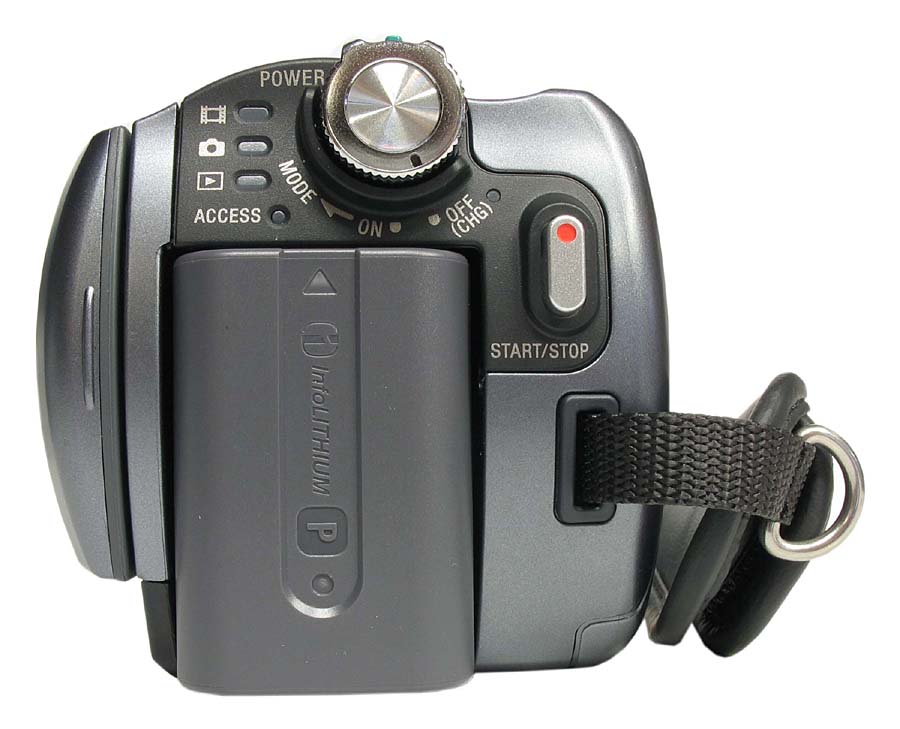 Ale zpět k popisu těla Sony SR70. Zepředu je poměrně velký fešácký objektiv s fešným logem (viz ob odstavec výš), v němž se pohybují jakési lamely hodinářského mechanismu automatické krytky, o níž jsem už psal. Vedle kotouče objektivu je na pohledu zepředu vlevo kontrolka nahrávání (ta při záznamu nebliká - svítí) a pod stříbrným kovovým kruhem jsou zde stereofonní mikrofony, které lze doplnit exterňákem ECM-HGZ1. Předchozí formulaci pouze předpokládám, protože kvůli této recenzi jednoúčelový doplněk brát na sklad nebudeme: a mimochodem je HGZ1 s MOC 2.490,- deklarován jako monofonní. No nic - hlavně že se TO nacpe do vyobrazené "inteligentní" botičky (ach JO). Další vyhledatelná fantazie s označením HVL-HV1 - 3W reflektor s MOC 1.490 - také asi nebude žádným trhákem. Zadní strana těla přístroje není osazena ničím navíc oproti nižším HDD-modelům: u AKU-výklenku je video-spouš a nad tímto prostorem sada kontrolek a již popsaný stříbrný hlavní vypínač (a volič režimů). Zezadu na SR70 je to už vše; a spodek je osazen stativovým závitem s aretační jamkou a konektorem pro popsané Dokovací Neštěstí (pracovně to zkrátím na DN)…