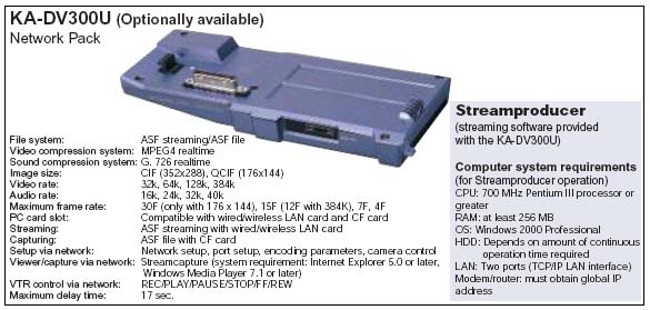 (klik, má 701kB) je udávána například paměová CF-karta. Na vloženou paměovou kartu lze zaznamenávat tzv. streamingové video kvality MPEG4 v rozlišení QCIF 176x144 (30f/s) nebo CIF 352x288 (12f/s) a datovým tokem až 384kbps, přičemž prospekt udává pro 512MB CF-kapacitu až 120 minut nahrávky. Ale aby onen kouzelný adaptér nebyl jen tak ledajakým, umožňuje ještě bezdrátový přenos do počítače (!) a prohlížení na obrazovce PC nebo Notebooku coby WEB-kamerou. Zmiňovaný prospekt